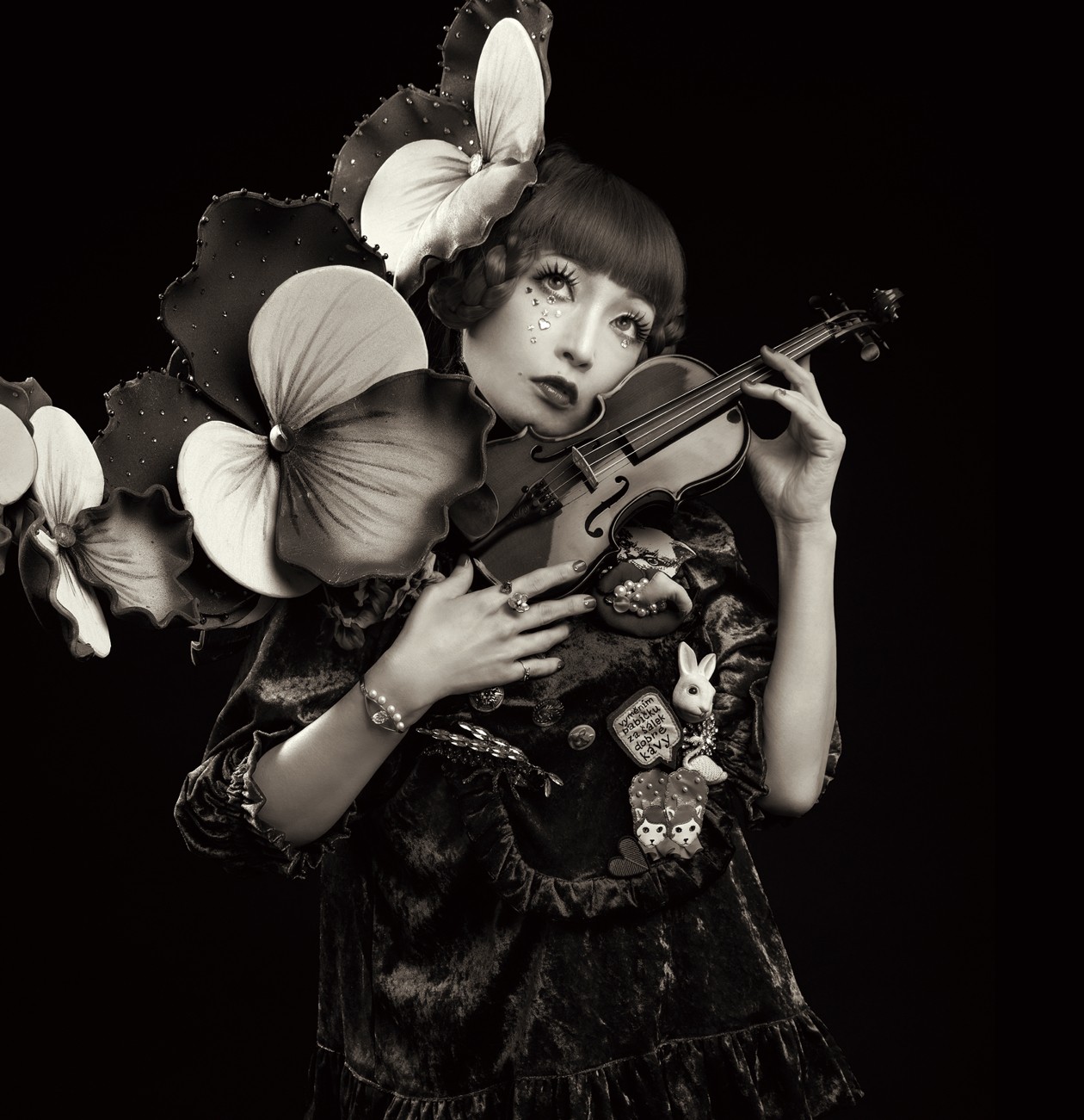 衣装協力 : うさぎ先生Sachi : 黒色すみれバイオリニストとして国内外にて活動。チェコガラスボタンを使用したジュエリーブランド「ČARUJ」プロデューサー。