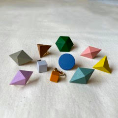 チェリーウッドからカットした幾何学形のオリジナル・ウッドピースに、ひとつひとつ色を作ってペイントした、すべて一点もののハンドメイドジュエリー。六角形、ダイヤモンド、半円、半月、丸などのピアスとイヤリングを販売予定です。Instagram